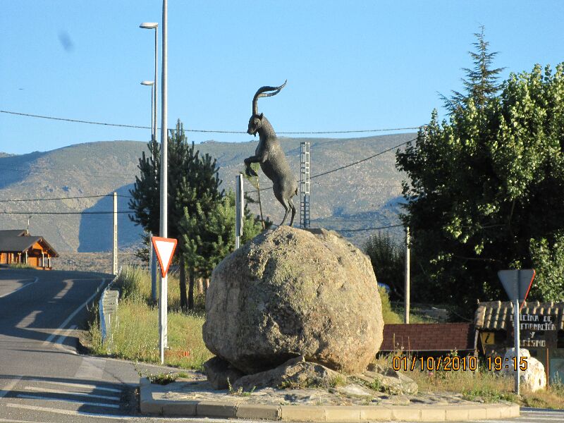 | Monumento a la Cabra Hispánica, en Hoyos del Espino. Desde esta rotonda sale la carretera que lleva a la Plataforma de Hoyos del Espino, punto de partida del camino que lleva a la Laguna Grande de Gredos. La Plataforma también es punto de partida de itinerarios que llevan al Puerto de Candeleda o a Los Galayos por Los Campanarios y La Mira. | ||