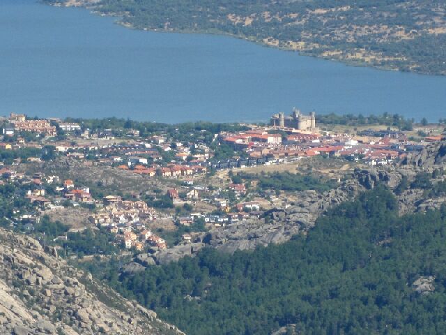 | Manzanares el Real y su Castillo desde el Collado de Los Pastores. (Foto hecha con mucho zoom). |