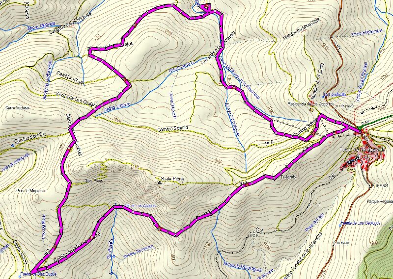 PUERTO DE NAVACERRADA (1858 m) - TELÉGRAFO (1969 m) - PRADERA DE SIETE PICOS (1939 m) - SENDA HERREROS - PRADERA DE NAVARRULAQUE (1900 M) - PRADERA DE MAJALASNA (1900 m) - SENDA DE LOS ALEVINES - COLLADO VENTOSO (1896 m) - PRADERA DE NAVALAVIENTO (1724 m) - PRADERA DE NAVALAZOR (1740 m) - ARROYO TELÉGRAFO (1500 m) - CARRETERA ASFALTADA - PUENTE SOBRE EL TELÉGRAFO (1550 m) - PISTA DE ESQUÍ - CAMINO SCHMIDT (1850 m) - PUERTO DE NAVACERRADA (1858 m) |