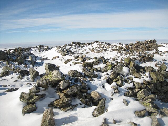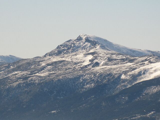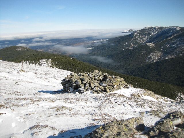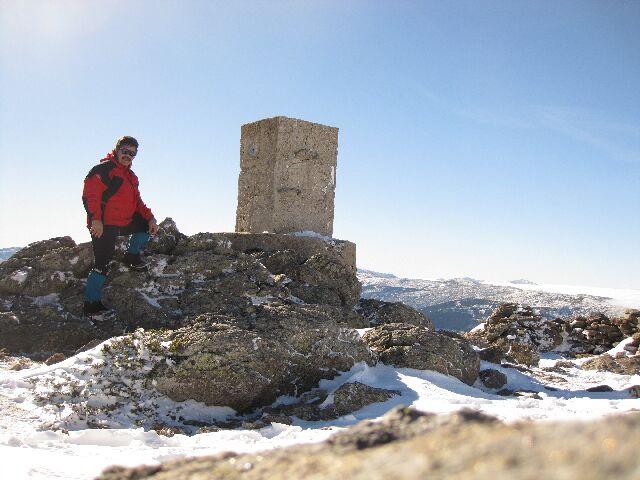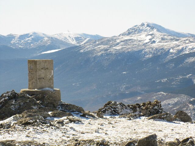Vértice Geodésico de la cima del Nevero. Un poco atípico, pero ahí está. Al fondo, Peñalara, Claveles y mas al fondo, las instalaciones de Valdesquí y la Bola del Mundo.