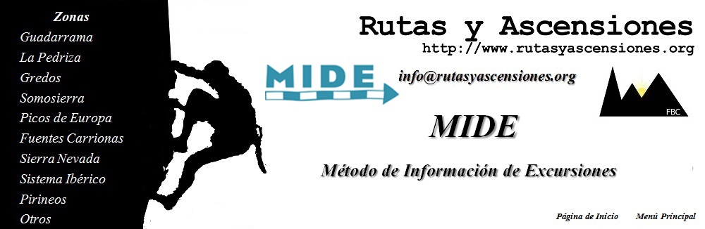 MIDE y WWW.RUTASYASCENSIONES.ORG Desde esta web se insiste en lo primordial de una buena planificación y una estrecha vigilancia de todos aquellos temas que tienen que ver con la Seguridad en la Montaña y la prevención de accidentes. Se recomienda revisar el apartado Material y Seguridad. |