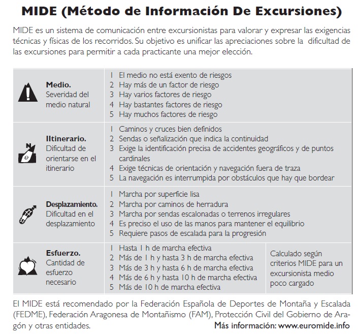 Obtenida la autorización de la Federación Aragonesa de Montañismo, la clasificación MIDE se irá incluyendo tan pronto como sea posible en todas las rutas que aparecen en esta web. |